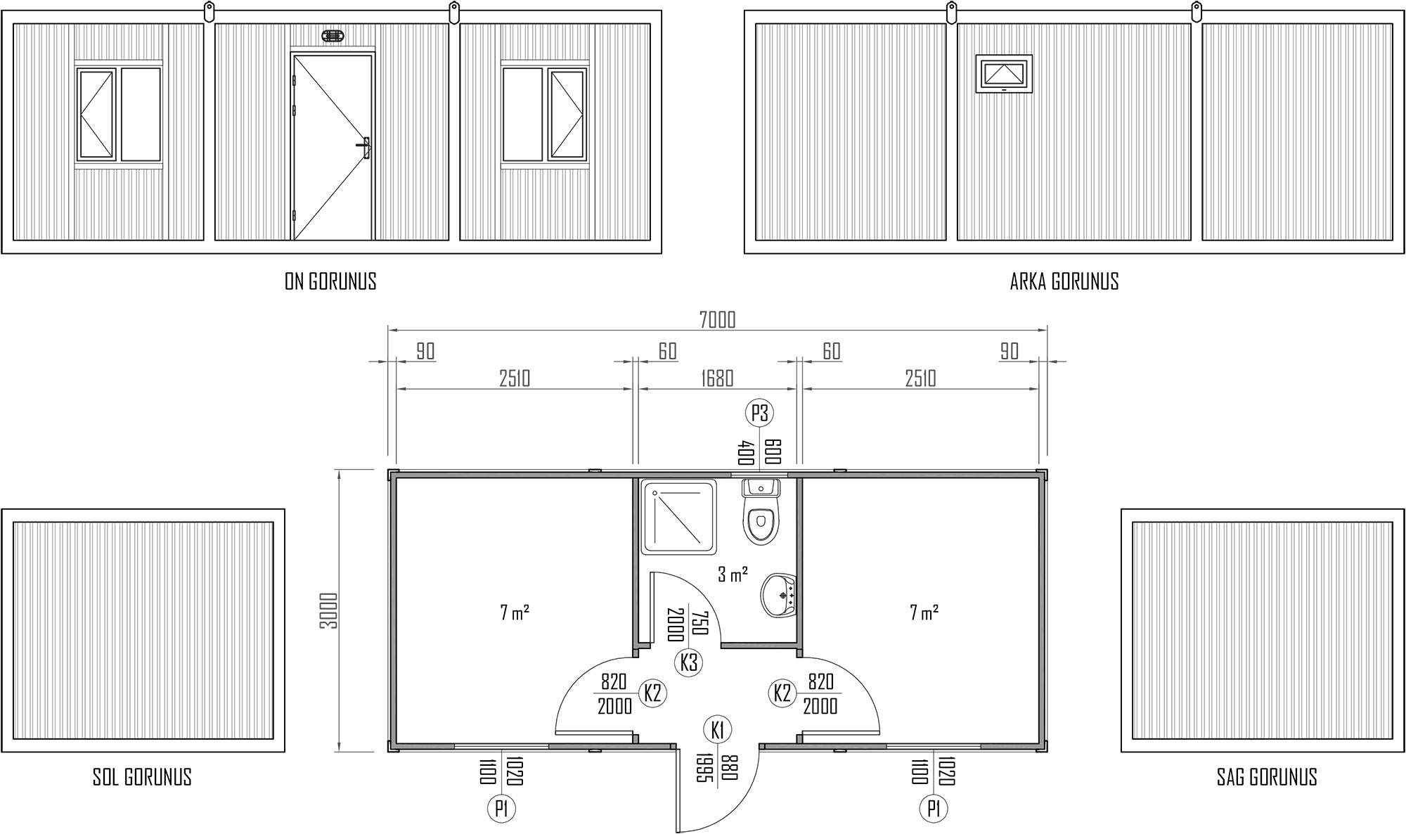 Taşıyıcı Çerçeve Tavan ve taban çerçeve kıvrımları ile köşe kolonları 2 mm pres büküm sacdan oluşmaktadır. Yatay ve dikey kayıtlar hazır profillerden oluşur.
