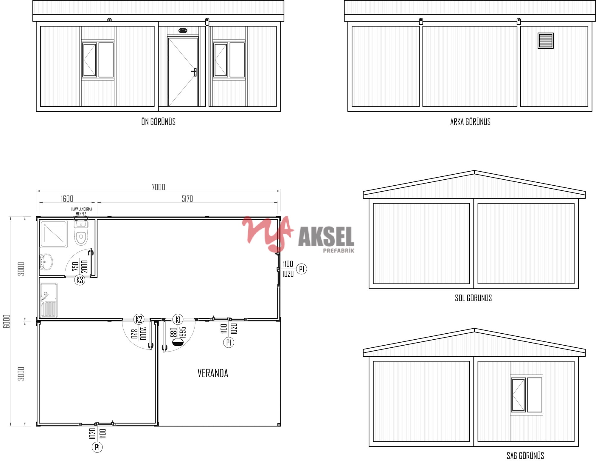 | Pencereler | 1000/1100 mm (4+12+4) ısıcamlı pvc doğramanVasistas|600/400 mm (4+12+4) ısıcamlı sabit sineklikli PVC doğrama |