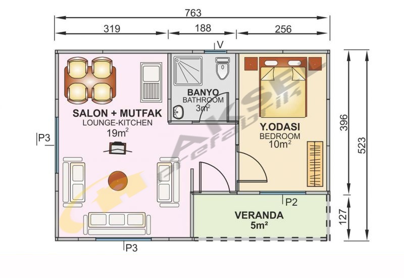 | Dış Yüzey | 8 mm kalınlığında neme dayanıklı çimento esaslı yonga levha üzeri Siding kaplama (istenilen renkte) |